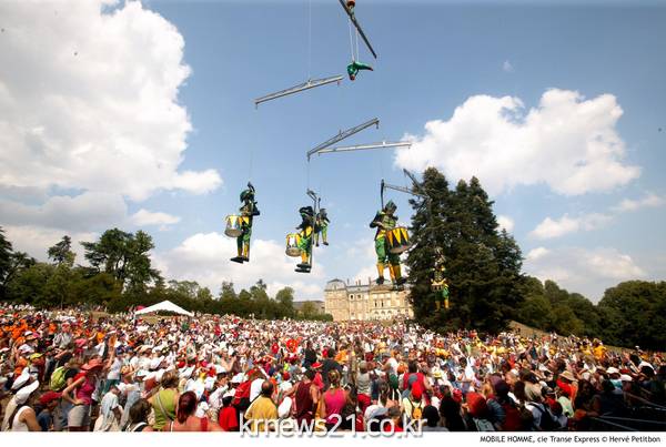 해외 초청작은 여섯 작품이다. ‘트랑스 익스프레스’(프랑스)가 공연하는 ‘인간 모빌(Mobile Homme)’은 크레인을 이용해 배우들을 40m 높이까지 끌어올려 펼치는 퍼포먼스다. 장난감 병정 모양 배우들이 마치 모빌처럼 크레인에 매달려 드럼을 치고, 그 위에서 공중그네 곡예사가 그네를 타며 연기를 펼친다.
