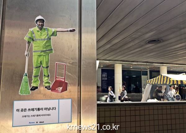 안양시 범계동(동장 홍순석)이 범계역 일대 주요 버스정류장과 평촌1번가 문화의 거리 등 유동인구가 많은 곳에 환경미화원 얼굴을 담은 스티커를 부착해 쓰레기 무단투기를 줄이고 있다.