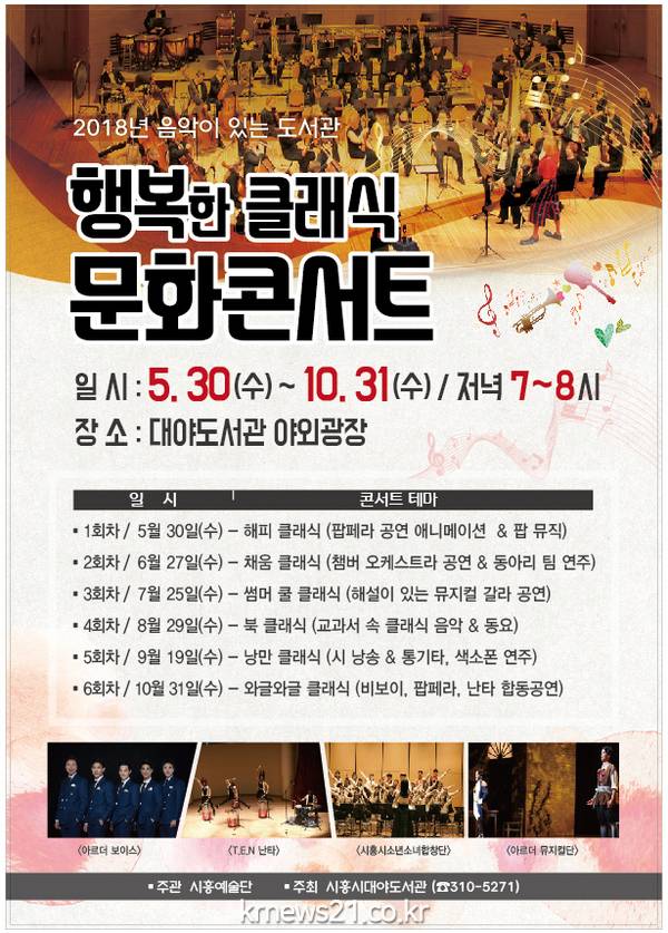 시흥시 대야도서관은 오는 5월 30일(수) 7시에 ‘해피 클래식’을 테마로 <2018</span>년 행복한 클래식 문화콘서트>를 시작한다.
