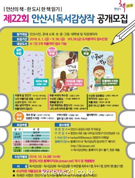 안산시 중앙도서관은 범시민 독서운동 ‘2018 안산의 책’과 연계해 「제22회 안산시 독서감상작 공개모집」을 한다고 밝혔다.