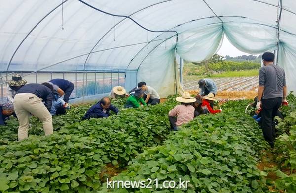 (전북/뉴스21)김문기기자=정읍시고부면과 주민생활과 직원들은 지난달 31일 일손 부족으로 어려움을 겪고 있는 농가 돕기에 구슬땀을 흘렸다.