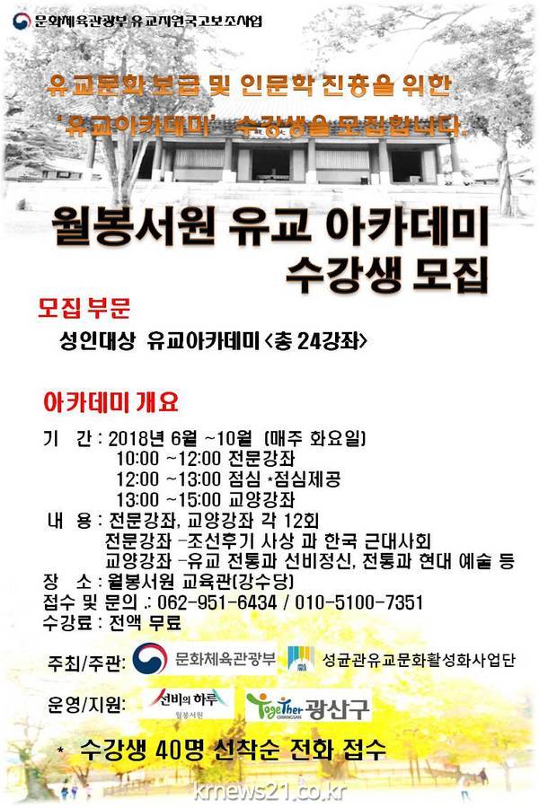 (뉴스21/장병기기자)=광산구(이성수 구청장 권한대행)가 월봉서원에서 유교와 사상·문화사, 선비정신과 전통·현대예술을 톺아보며 더위를 잊을 ‘유교아카데미’ 수강생을 40명을 17일까지 선착순 모집한다.