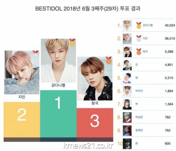6월 3주차 베스트 아이돌 투표 결과 강다니엘(워너원)이 1위, 지민(방탄소년단)이 2위, 정국(방탄소년단)이 3위를 차지했다.