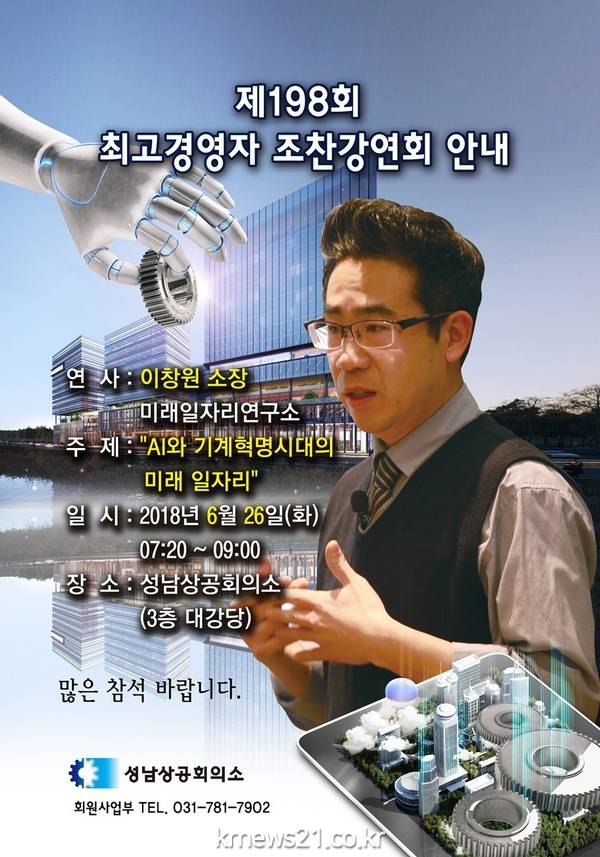 성남상공회의소(회장 박용후)는 오는 6월 26일(화) 오전 7시 20분에 3층 대강당에서 회원사 대표 및 임원, 기관장을 초청해「제198회 최고경영자 조찬강연회」를 개최한다.