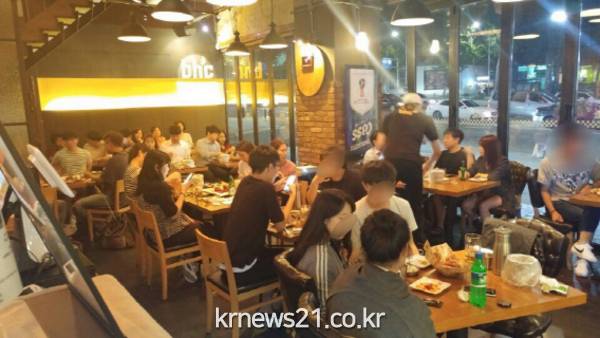 ▲ bhc치킨 매장에서 손님들이 ‘치맥’을 즐기며 월드컵 경기를 관람하고 있다. (사진=bhc)‘2018 러시아 월드컵 대회’ 첫 경기에서 국가대표팀은 스웨덴에 0대1로 졌지만, 전국 편의점과 치킨업계는 평소보다 껑충 뛴 매출로 함박 웃음을 지었다. 16강 진출은 못했지만, ‘어게인 2002’를 염원하는 국민들 덕분에 거리 응원 인근 편의점뿐만 아니라 맥주와 안주류, 야식거리가 폭발적으로 팔려나갔다.
