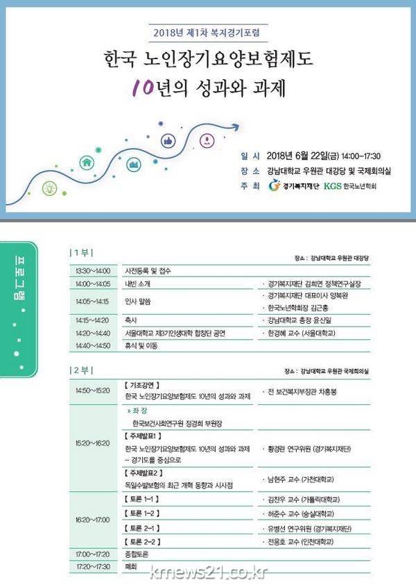 경기복지재단(대표이사 양복완)은 22일 오후 2시 강남대학교에서 ‘노인 장기요양보험제도의 성과와 과제’를 주제로 한국노년학회(회장 김근홍)와 복지경기포럼을 공동 개최한다.