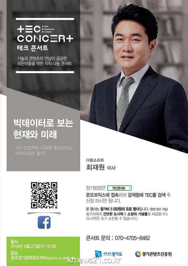 경기도와 경기콘텐츠진흥원은 기술과 콘텐츠 분야에 관심 있는 일반인과 창업자 등을 위한 ‘TEC(테크)콘서트’ 시즌2 첫 회를 27일 오후 7시 수원시 광교비즈니스센터 11층 광교 경기 문화 창조허브에서 개최한다.