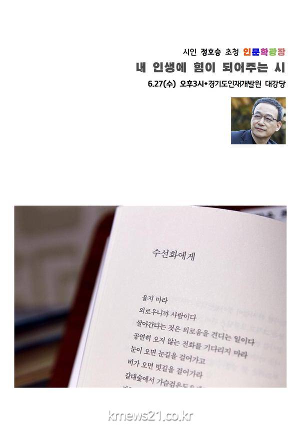 경기도인재개발원이 오는 27일 오후 3시부터 2시간 동안 경기도인재개발원 대강당에서 ‘내 인생에 힘이 되어주는 시’를 주제로 올해 다섯 번째 인문학광장을 연다.