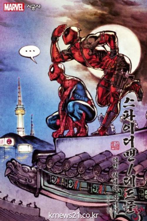 서울 도심을 배경으로 궁궐 추녀마루 위에 마치 한 조각 잡상인양 자리 잡은 스파이더맨과 그를 놀리듯 팔을 기대고 선 데드풀의 케미넘치는 면면을 잘 잡아낸 이번 커버는 개성 있는 동양적 화풍이 특징이다.