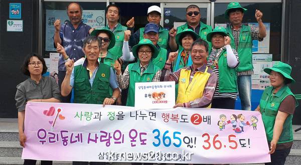 △지난 25일 여수시 삼일동 새마을협의회원과 새마을부녀회원들이 나눔 사업을 위한 후원금 30만 원을 김상운 삼일동장(왼쪽 네 번째)에게 전달하고 있다.