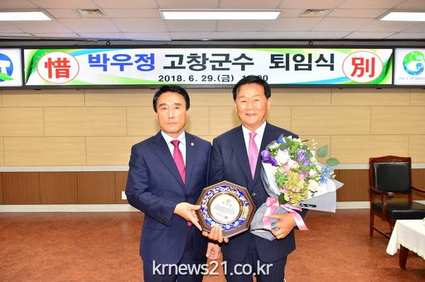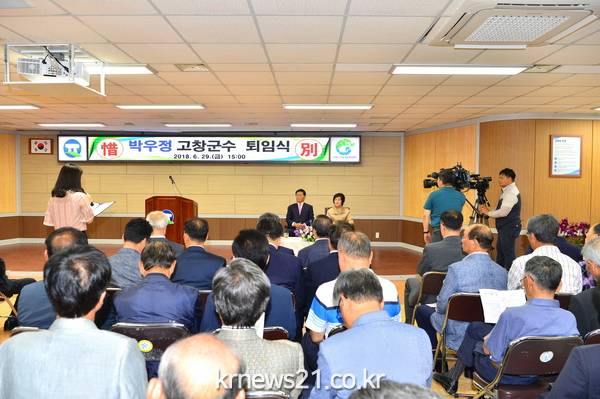 29일 오후 고창군청 대회의실에서 진행된 퇴임식에는 최인규 군의회의장과 군의원, 이수혁 국회의원, 기관사회단체장, 공무원과 군민 등이 참석했다. 이날 고창군과 군의회, 모양회, 농협중앙회고창군지부와 지역농협, 고창부안축협, 이장단연합회, 고창수협, 고창군공무원노동조합, 고창군 공무직노동조합 등 많은 기관 단체가 지역발전을 위해 헌신한 박우정 군수의 민선 6기의 공적과 그간의 노고에 대한 감사의 마음을 담은 공로패와 감사패를 전달했다.