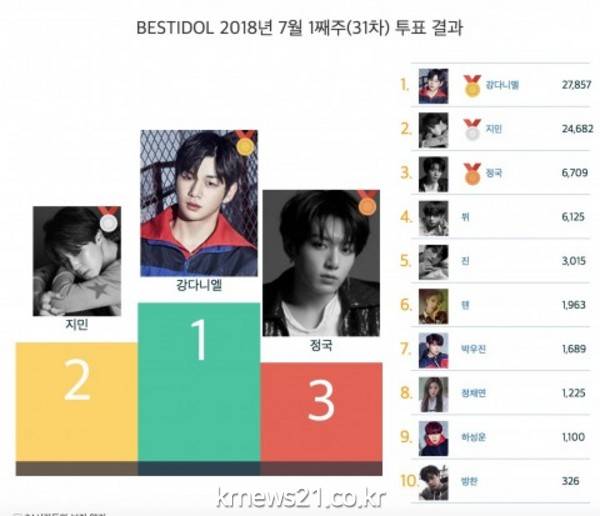 ▲ 2018년 6월 5주 베스트아이돌 투표 결과강다니엘(워너원)이 6월 5주차 베스트 아이돌 투표에서 1위를 차지하며, 20주 연속 1위를 달성했다. 지민(방탄소년단)이 2위, 정국(방탄소년단)이 3위를 차지했다. 지민과 정국은 각각 7주 연속 2위, 5주 연속 3위를 기록했다.