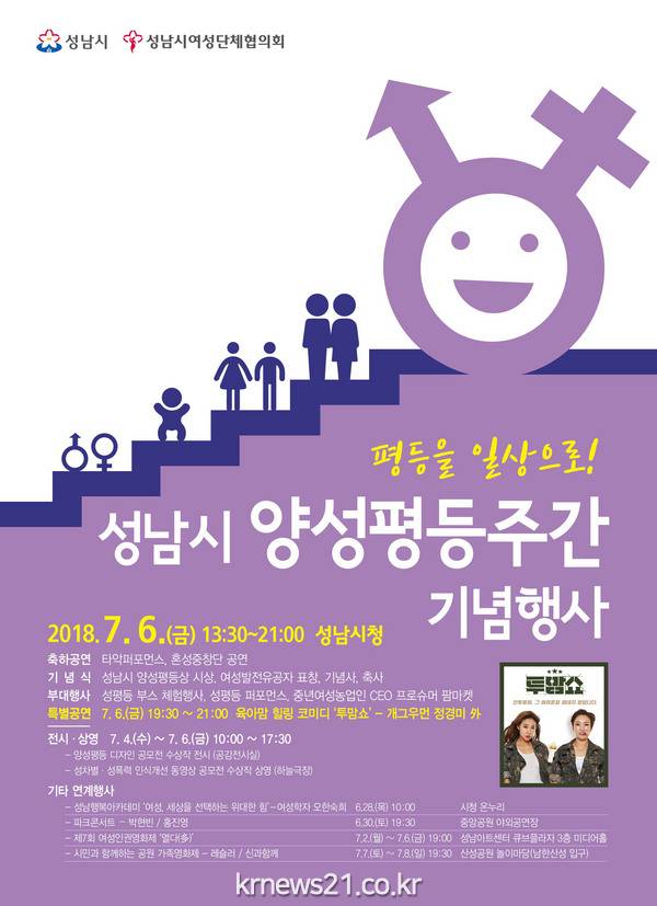 성남시(시장 은수미)는 양성평등주간(7.1~7)을 맞아 일상생활 속 성차별 개선과 성 평등 문화·인식을 확산하기 위한 다양한 행사를 연다.