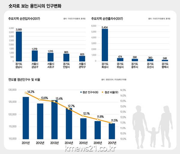 지난 해 분당과 강남에서 많은 시민들이 용인으로 이주한 반면에 비슷한 정도의 용인시민이 화성으로 이주해간 것으로 나타났다. 또 용인시 청년인구 비율은 지속적으로 감소할 뿐 아니라 전국 평균이나 경기도 평균에 비해서도 낮은 것으로 분석됐다.