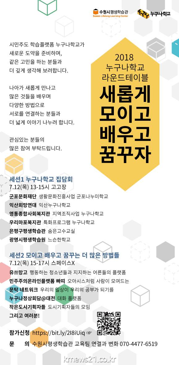 수원시평생학습관은 12일 오후 1시 팔달구 평생학습관에서 ‘새롭게 모이고 배우고 꿈꾸자’를 주제로 ‘2018 누구나 학교 라운드테이블(원탁회의)’을 연다.