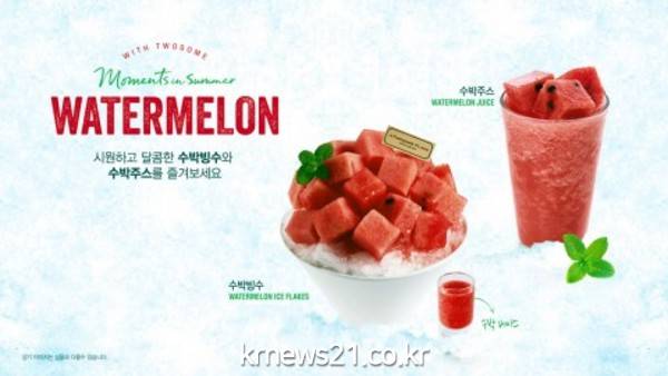 투썸플레이스 ‘수박 빙수’는 곱게 갈은 얼음 위에 수박을 가득 올리고 얼음 속에는 달콤한 딸기를 더해 두 가지 과일 맛을 동시에 즐길 수 있는 제품이다. 함께 출시한 ‘수박 주스’는 수박을 듬뿍 넣어 갈아 만든 주스에 큼직한 사각 형태의 수박을 올려 신선함을 강조했다.