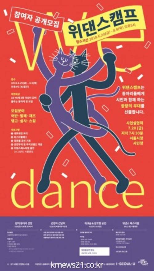 ▲ 위댄스캠프 참여자 모집 포스터서울문화재단(대표이사 주철환)이 춤으로 신나는 서울시민의 삶을 위해 8월 9일(목)까지 2040 춤 동호회를 위한 ‘위댄스캠프’와 4080 시니어 춤 경연대회인 ‘서울춤자랑’ 참가단체를 모집한다.