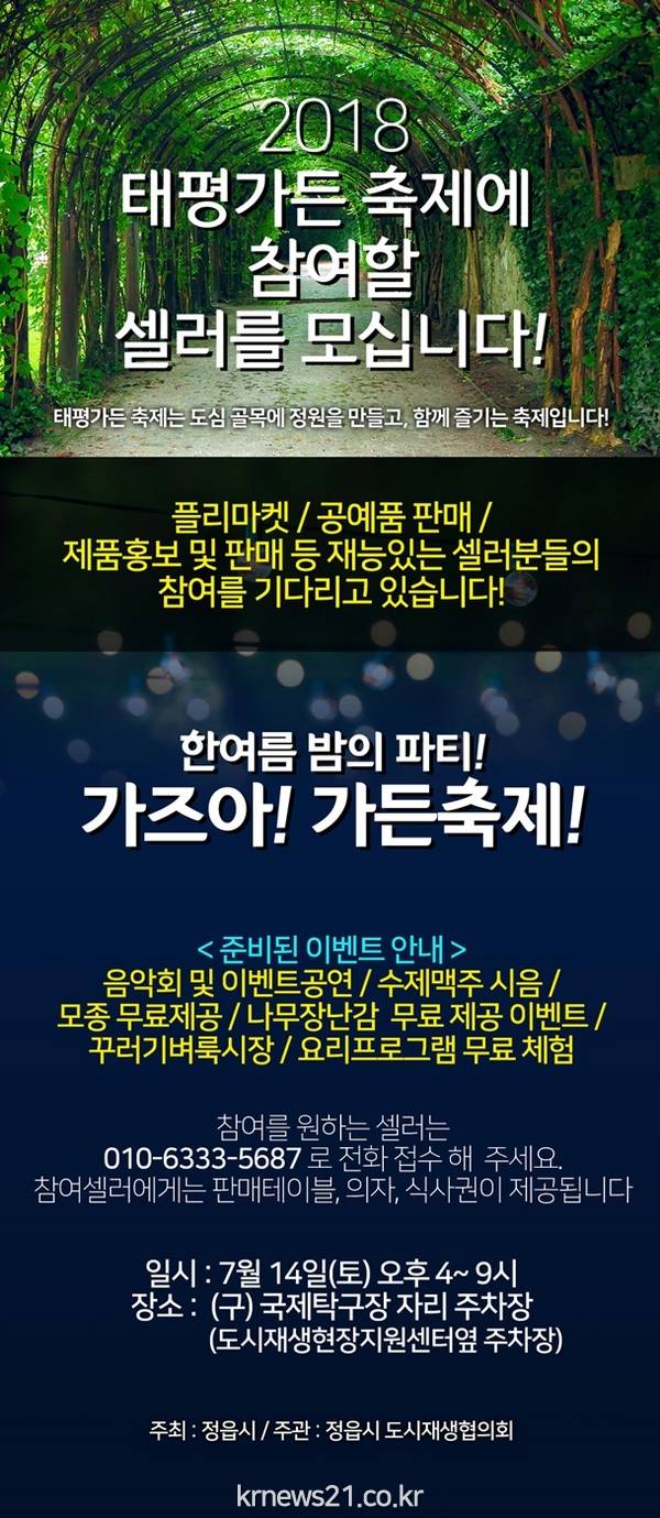 정읍시가 주최하고 ‘돌아오는 샘고을(2017 도시재생공동체협의회)’이 주관하는 ‘태평가든(Taepyung Garden) 축제’가 13일 전야제를 시작으로 14일 오후 4시부터 9시까지 태평로 내 공영 주차장(옛 국제탁구장)에서 열린다.