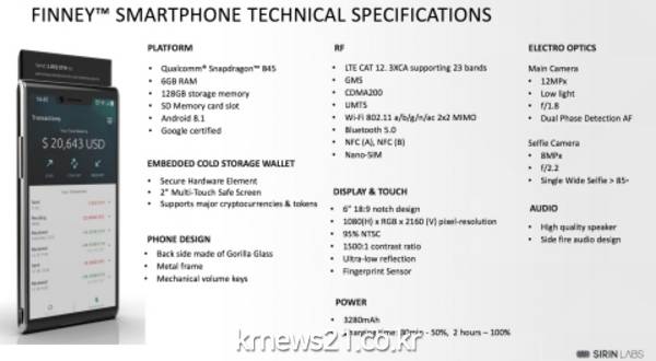 ▲ 최초의 블록체인 스마트폰 핀니 제품사양2017년 크라우드 세일로 1억5780만달러를 모금하여 세계에서 4번째로 큰 크라우드 세일으로 기록된 시린랩스는 세계 최초 블록체인 스마트폰 핀니의 최종 디자인을 공개합니다.