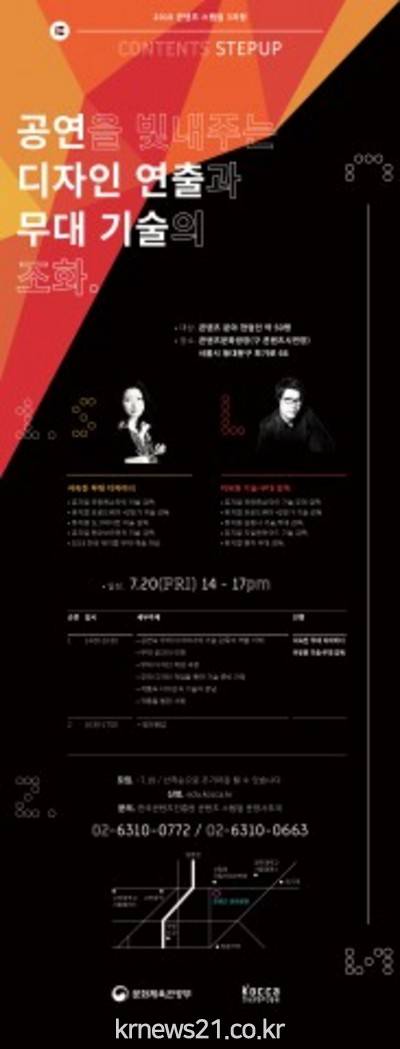 문화체육관광부(장관 도종환)와 한국콘텐츠진흥원(KOCCA·원장 김영준)은 공연 무대 연출 관련 분야의 종사자들의 전문성 향상을 위한 현업인 직무교육 ‘콘텐츠 스텝업’ 3차 과정을 진행하고, 19일까지 참가 희망자를 모집한다.