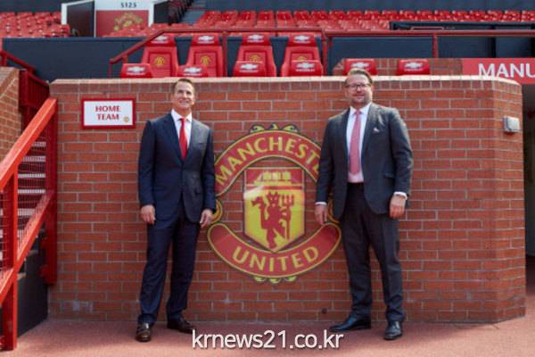 ▲ 올드 트래포드 경기장의 데이비드 콜러(사진 왼쪽)와 MU그룹 상무이사 리처드 아놀드맨체스터 유나이티드(Manchester United)와 미국 위스콘신주 콜러에 본사가 있는 글로벌 라이프스타일 브랜드인 콜러(Kohler Co.)가 다년간의 글로벌 파트너십 계약을 체결했다.