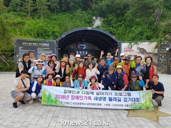 인천내부장애인 협회에서 새생명 둘레길 걷기대회를 광명동굴로 가서 기념촬영을 하고 있다.