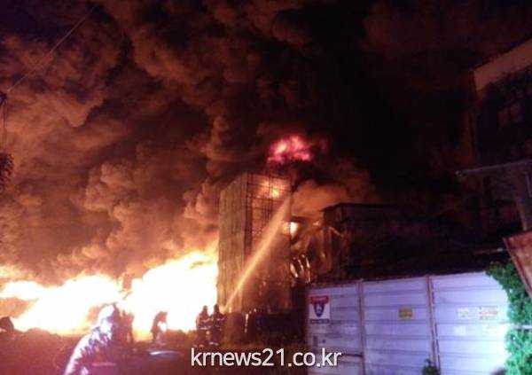▲ (사진=인천소방본부)인천소방본부에 따르면 16일 오후 11시 40분께 인천시 서구 오류동 검단5도시 개발사업구역 내 합성수지 제조업체 신안합성 공장에서 큰불이 났다.