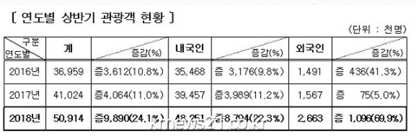 ▲ (사진=강원도청)강원도의 2018년 상반기 주요관광지점 방문객 통계분계 자료에따르면, 올해 상반기 강원도를 찾은 국내외 관광객은 2017년 동기 대비 989만명(24.1%)이 늘어난 5,091만명으로 내국인 관광객은 전년동기 대비 22.3%가 증가한 4,825만명, 외국인 관광객은 전년동기 대비 69.9%가 늘어난 266만명으로 조사됬다.