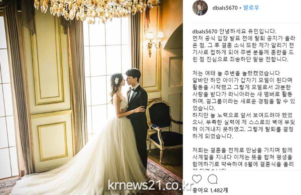 ▲ (사진=라니아 유민 인스타그램)유민은 7월 17일 개인 인스타그램에 장문의 글을 게재, P군과 결혼을 결정하기까지 과정을 털어놨다.