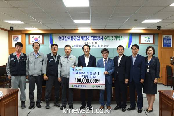 (뉴스21/목포)=현대삼호중공업이 18일 목포복지재단에 세월호 직립공사 수익금을 기탁했다.