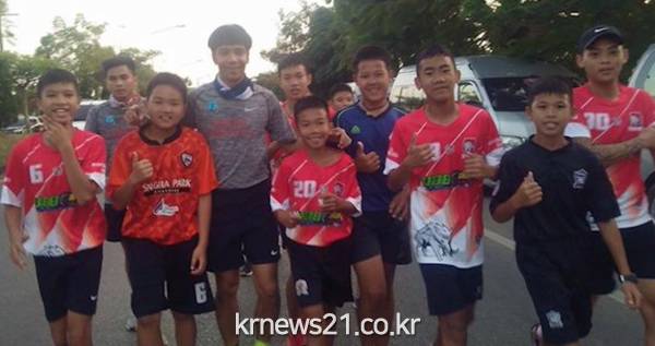소년 12명과 코치는 이날 팀의 상징인 붉은색 멧돼지가 인쇄된 유니폼을 입고 기자회견장에 등장해 축구 시범 등을 보인 후 밝은 얼굴로 당시 상황을 털어놓았다.