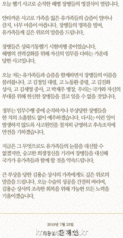 문 대통령은 이날 트위터에 “오늘 헬기사고로 순직한 장병들의 영결식이 열린다. 안타까운 사고로 가족을 잃은 유가족들의 슬픔이 얼마나 클지 너무 마음이 아프다”며 “장병들의 명복을 빌며, 유가족에게도 깊은 위로의 말씀을 드린다”며 운을 뗐다.