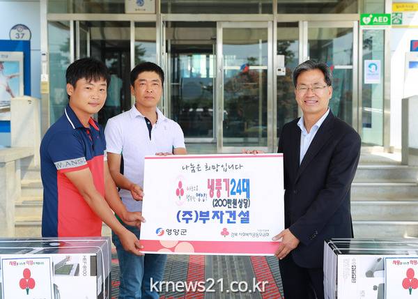 ▲ (사진=영양군청)영양군은 ㈜부자건설이 폭염에 무방비로 노출된 관내 에너지 빈곤층에게 전달해 달라며 시원한 얼음냉풍기 24대(200만원)를 기부하는 전달식을 가졌다.