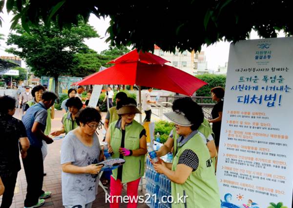 이날 행사에는 진광식 대구시 시민행복교육국장이 현장을 찾아 시민 안전 캠페인 참여와 기업 자원봉사단과 함께 시원한 병입수돗물, 물티슈, 부채 등을 나눠주며 더위에 지친 어르신을 위로하고 현장에서 땀 흘리는 기업 자원봉사자들을 격려한 계획이다.