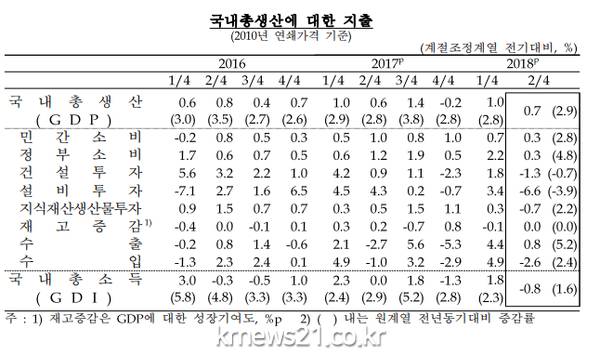 한국은행이 26일 발표한 실질 국내총생산, GDP 속보치를 보면 지난 2분기 GDP는 398조 3천351억 원으로 지난 분기보다 0.7% 성장했습니다. 이는 지난 1분기 성장률인 1%보다 0.3% 포인트 낮은 수치이다.