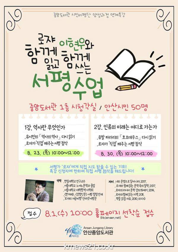 안산시 중앙도서관(관장 최경호)은 시민 서평단 양성과정의 연계특강으로 ‘로쟈 이현우와 함께 읽고 함께 쓰는 서평수업’을 진행한다.