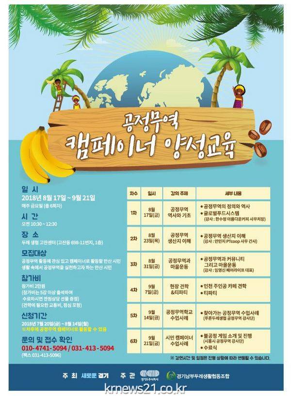 수료자는 공정무역 캠페이너로 활동할 수 있다. 접수기간은 8월 14일까지이며, 신청은 경기남부두레생활협동조합(031-413-5094)으로 하면 된다.