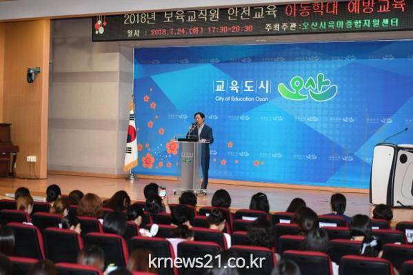 오산시(시장 곽상욱)는 오산시 육아종합지원 센터와 함께 지난 24일 시청 대회의실에서 관내 어린이집 원장 및 보육교직원 400여명을 대상으로 아동학대예방을 위한 교육과 성폭력‧실종 예방 및 사후관리 교육을 실시했다.