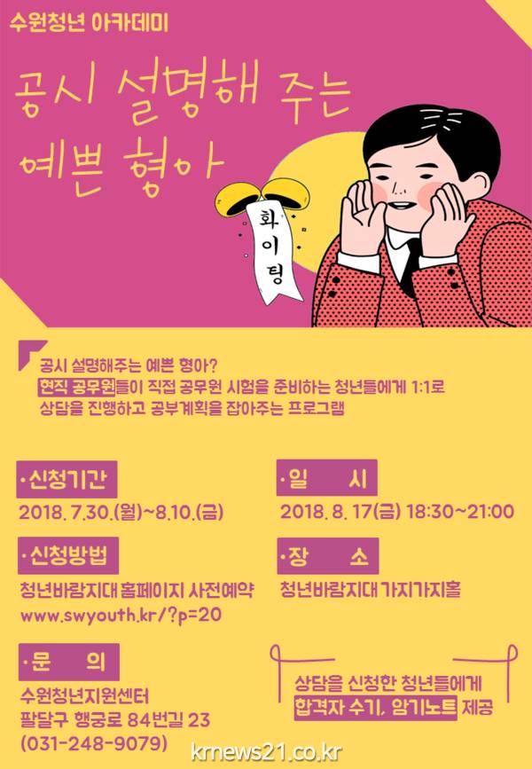 수원시 청년지원센터가 다음달 17일 공무원 시험(공시)을 준비하는 청년들과 현직 공무원과의 일대일 컨설팅을 지원하는 ‘공시 설명해주는 예쁜 형아’ 특강을 연다.