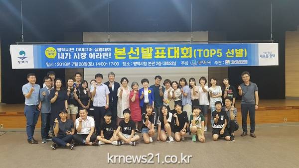 한편, “2018 평택시민 아이디어 실행대회”는 시민들이 일상생활에서 느끼는 다양한 문제에 대해 해결방안이나 아이디어를 제안하고, 아이디어 실행을 지원하는 시민참여 대회로, 지난 4월 16일부터 6월 30일까지 총 42팀이 44개의 아이디어를 접수했으며, 11월로 예정된 결선발표대회에서 최종 우승팀을 가린다. 입상한 팀에게는 총 500만원의 상금이 주어진다.