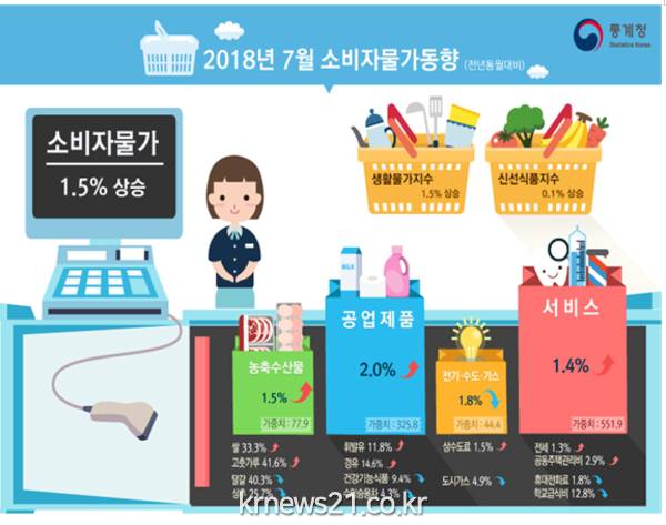 ▲ (사진=통계청)7월 소비자물가가 10개월 연속 1%대 저물가를 이어갔지만 폭염으로 채소값이 급등해 이른바 장바구니 물가(체감 물가)와 괴리 현상도 지속됐다.