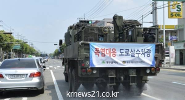 ▲ (사진=대구시청)대구시는 기후변화로 인하여 올 여름 폭염이 유례없이 장기화됨에 따라 도심열섬 완화, 폭염피해 예방을 위하여 도로 물뿌리기 작업을 한층 강화하고 있다.