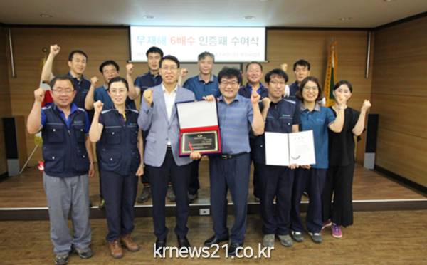 ▲ (사진=대구광역시청)대구환경공단, 북부사업소는 안전을 최우선 과제로 삼아 2011년 1월 11일부터 무재해운동을 추진한 결과 무재해 목표 6배수를 달성하여 7월31일 한국산업안전보건공단으로부터 인증서 및 표창장을 수여받았다.