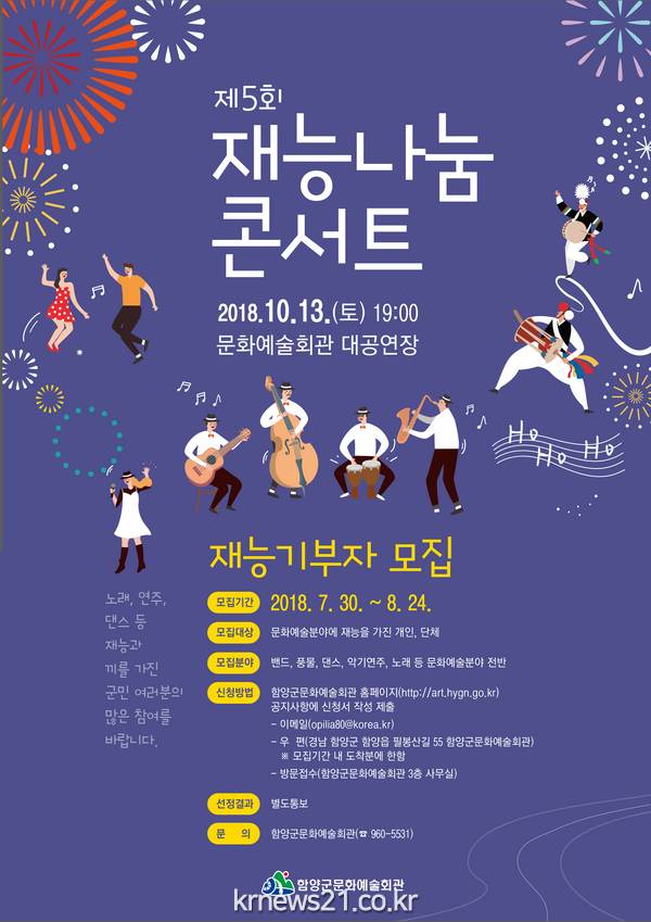 군에 따르면 올해로 5회째를 맞는 재능나눔 콘서트는 오는 10월 13일 오후 7시 함양군문화예술회관 대공연장에서 개최되며, 참여를 희망하는 밴드, 풍물, 댄스, 악기연주, 노래 등 문화예술분야 재능을 가진 개인이나 단체는 오는 24일까지 신청하면 된다.