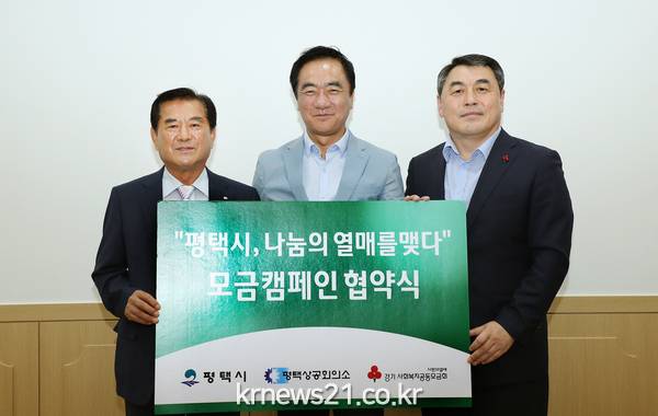 평택상공회의소(회장 이보영)는 7일 평택시청에서 평택시․경기 사회복지 공동모금회와 평택시 나눔 문화 확산을 위한 ‘평택시, 나눔의 열매를 맺다’모금캠페인 협약식을 가졌다.