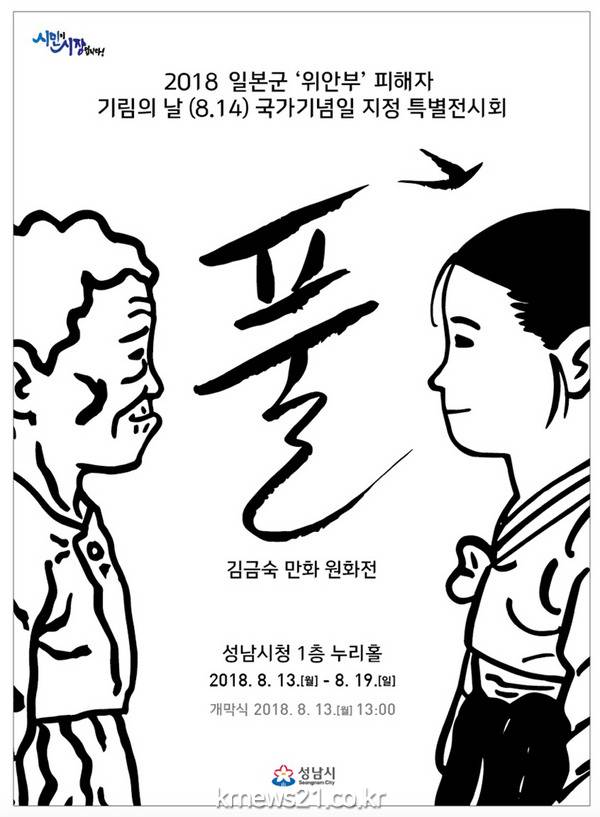성남시는 오는 8월 13~19일 시청 로비에서 일본군 ‘위안부’ 피해자의 삶을 묘사한 김금숙(47·여) 작가의 장편 만화 ‘풀’ 원화전을 연다.