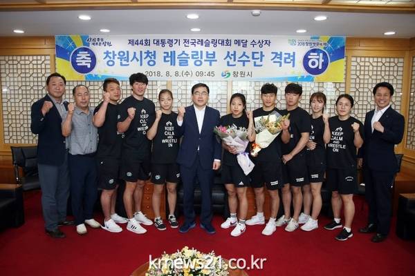 ▲ (사진=창원시청)허성무 창원시장은 시청 접견실에서 ‘재44회 대통령기 전국레슬링대회’에서 우수한 성적으로 거둔 창원시청 레슬링부 선수단을 격려했다.