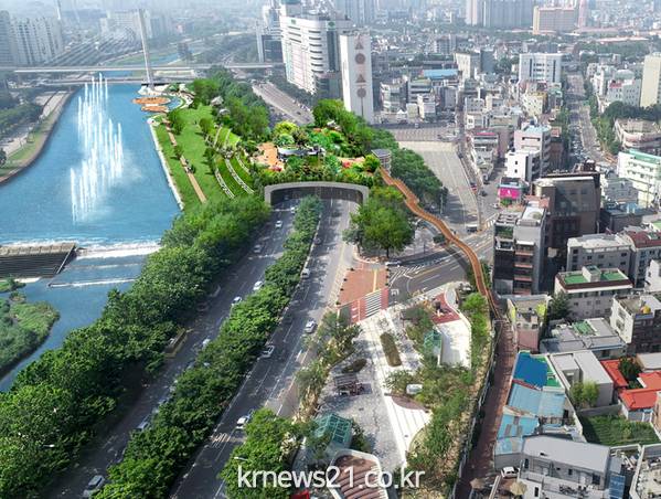 ▲ (사진=대전광역시청)대구시는 2019년부터 2021년까지 123억 원을 투입하여 김광석거리 남쪽길에서 대봉교 하류 신천 둔치까지 신천대로를 덮어 ‘신천녹도’를 조성한다.