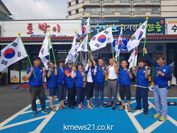 ▲ (사진=충주시청)충주시 수안보면 바르게살기위원회(위원장 허남식)가 제73주년 광복절을 앞두고 8일 수안보 풍물시장 상가에 태극기를 게양하고 태극기 달기 홍보 캠페인을 전개했다.
