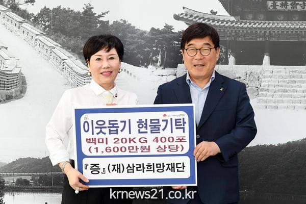 ▲ (사진=광주시청)SM(삼라마이다스)그룹 삼라희망재단(대외협력 총괄사장 우현의)은 광주시를 방문해 어려운 이웃에게 전달해 달라며 백미 400포(20㎏, 1천600만원 상당)를 기탁했다.